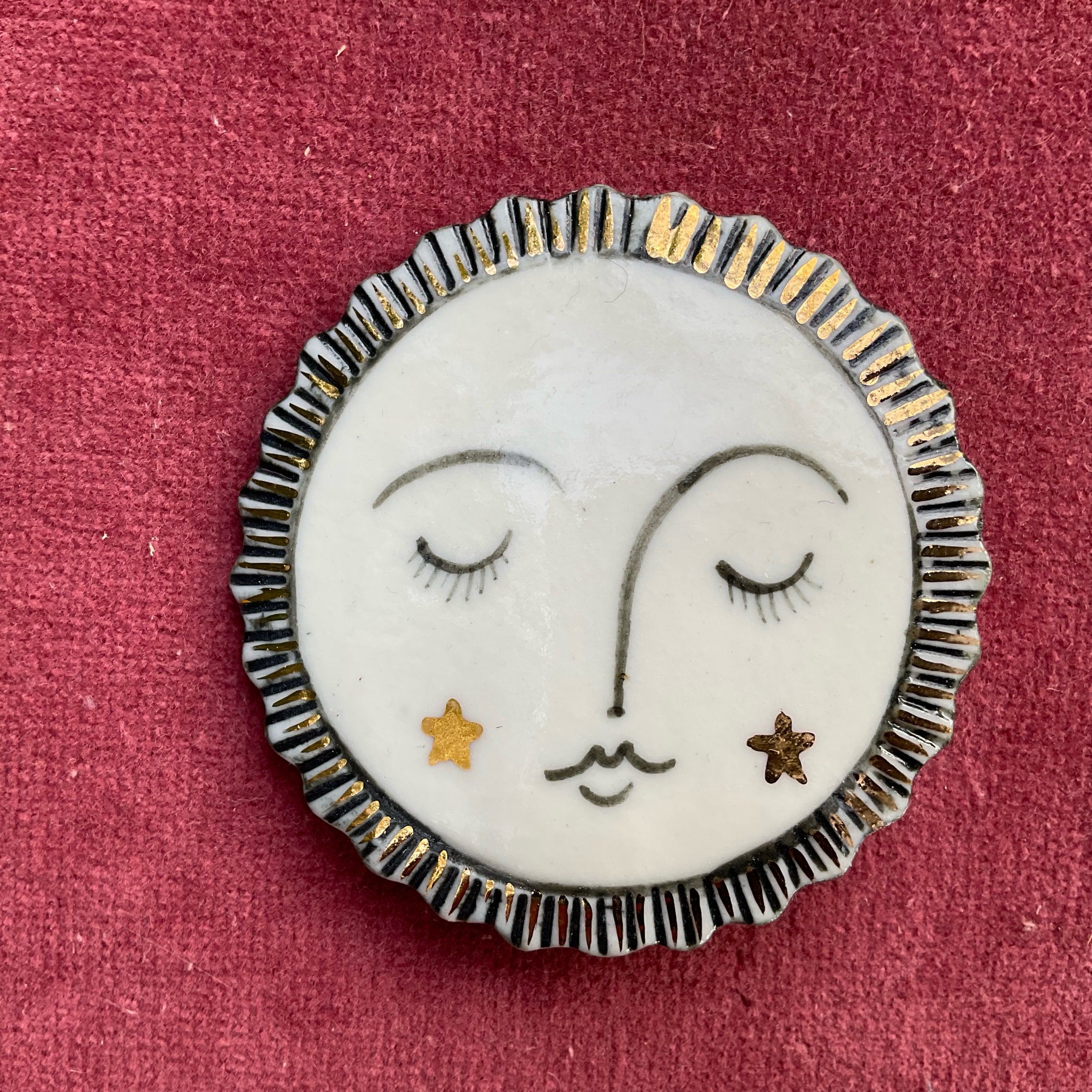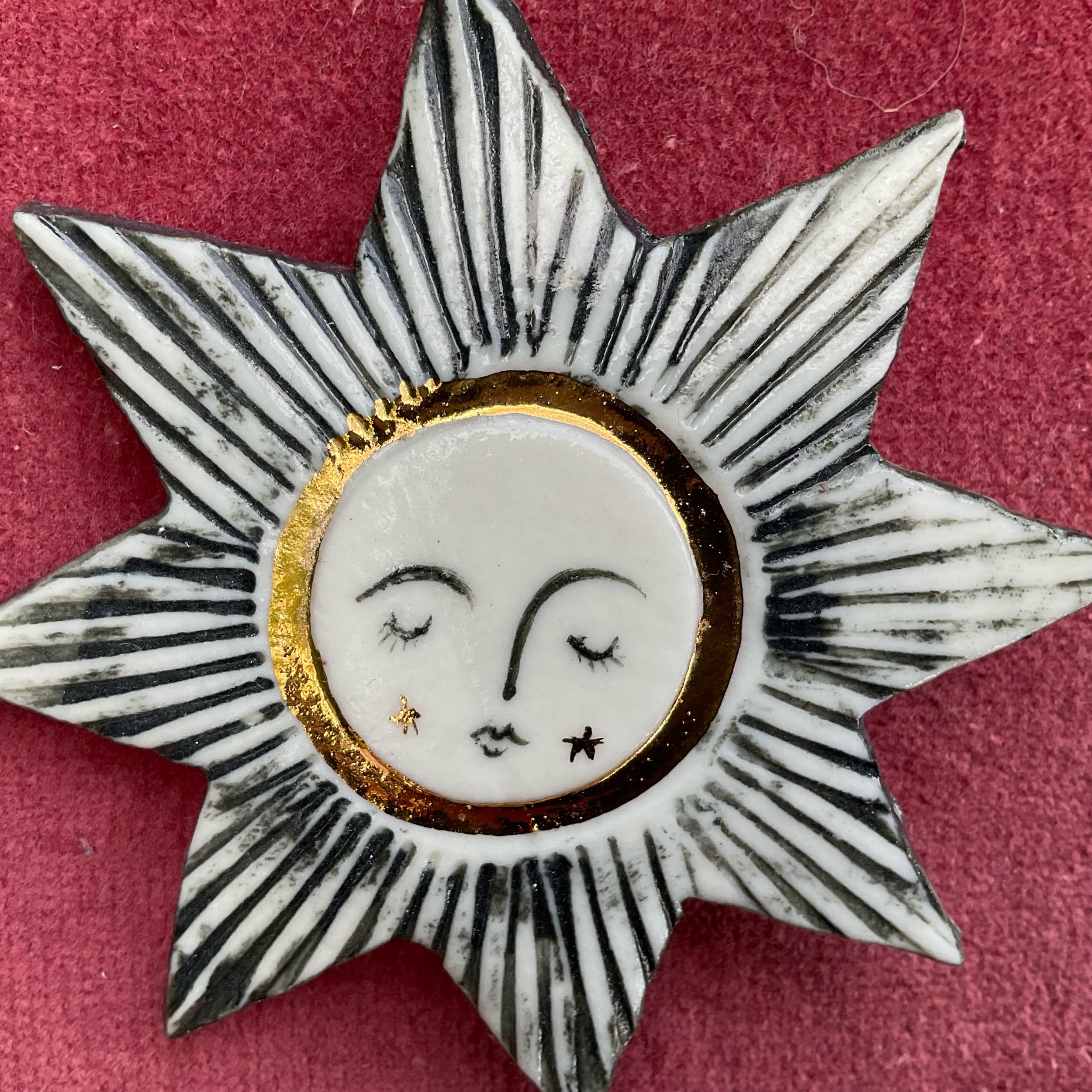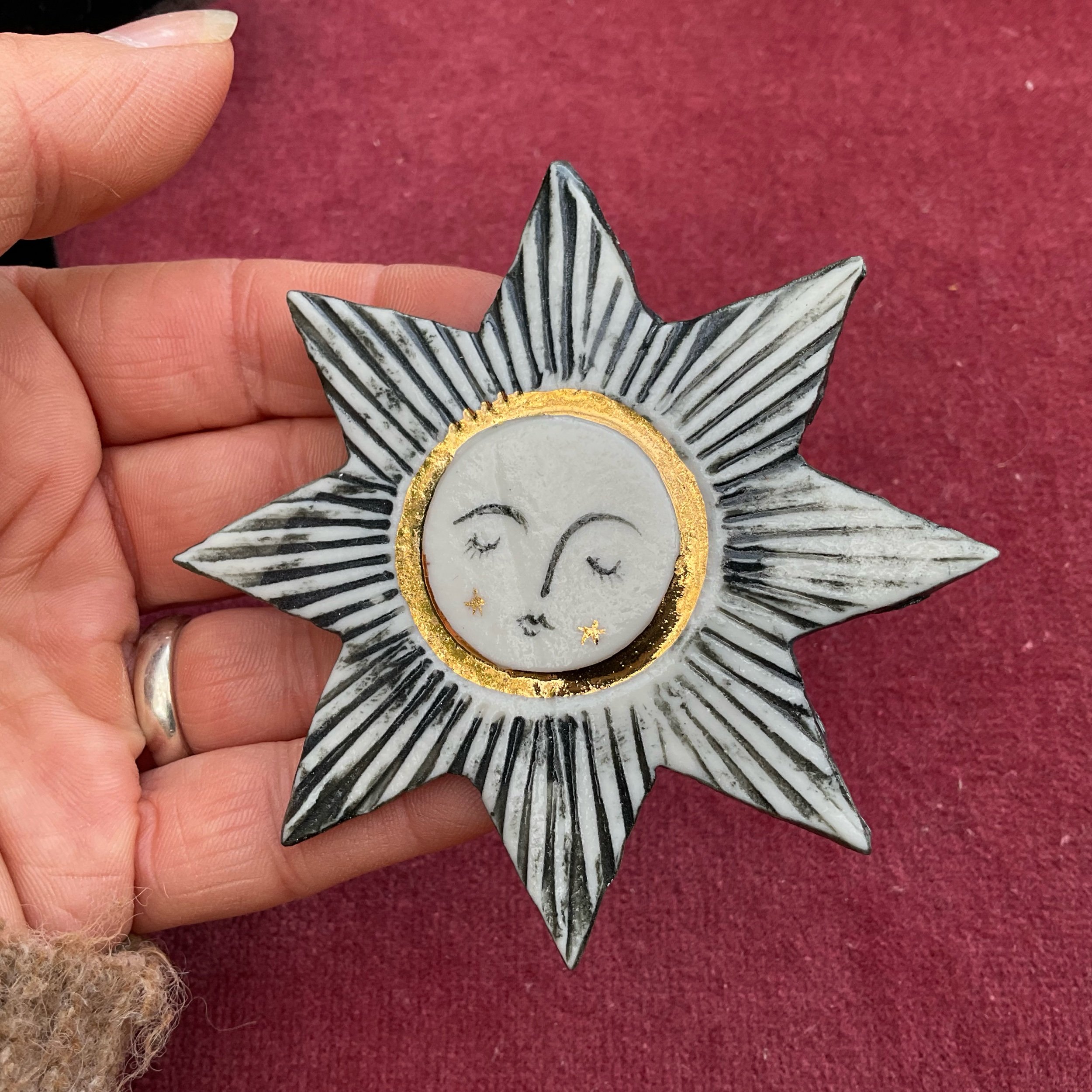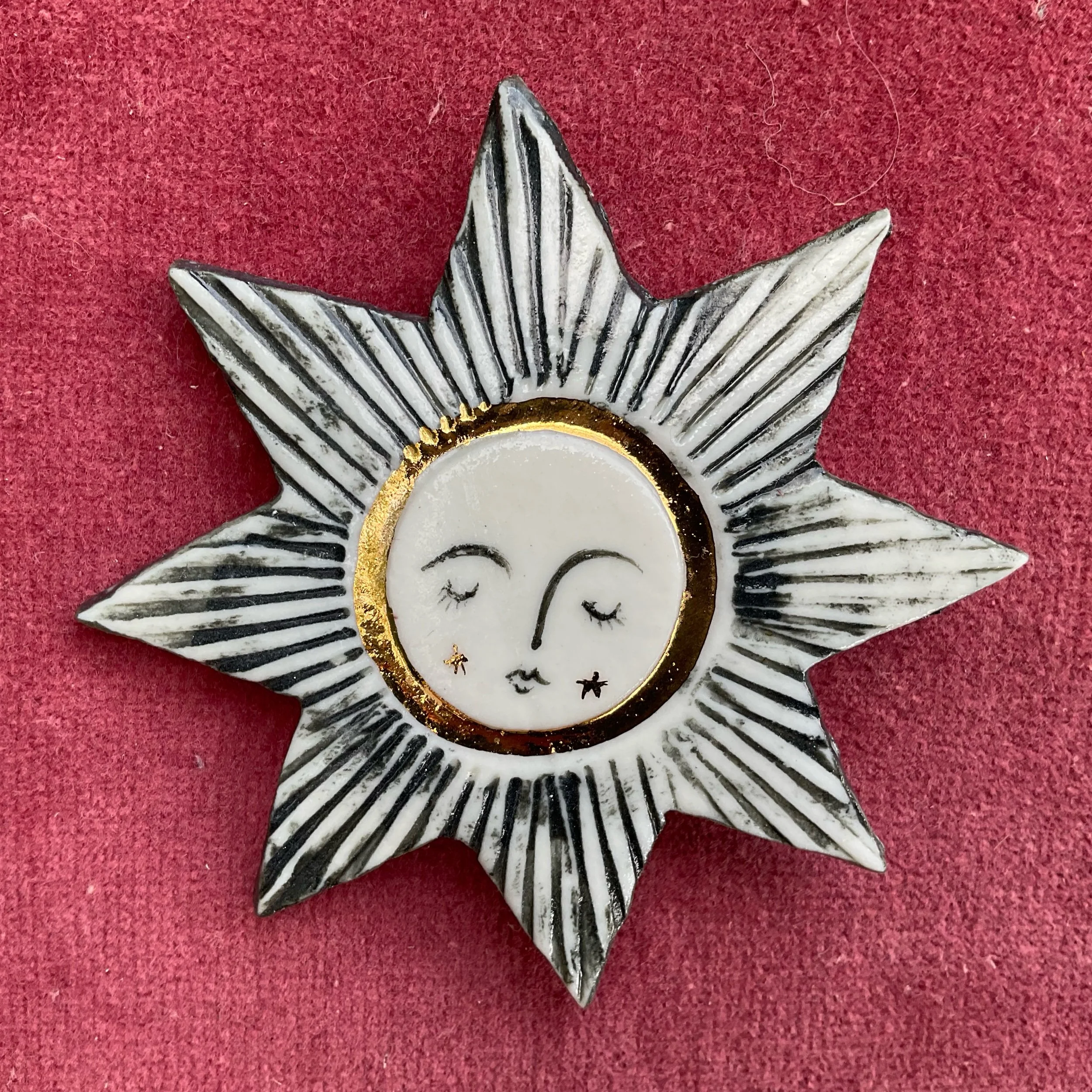 Lovely star brooch with slip and gold lustre decoration. Handmade in porcelain.