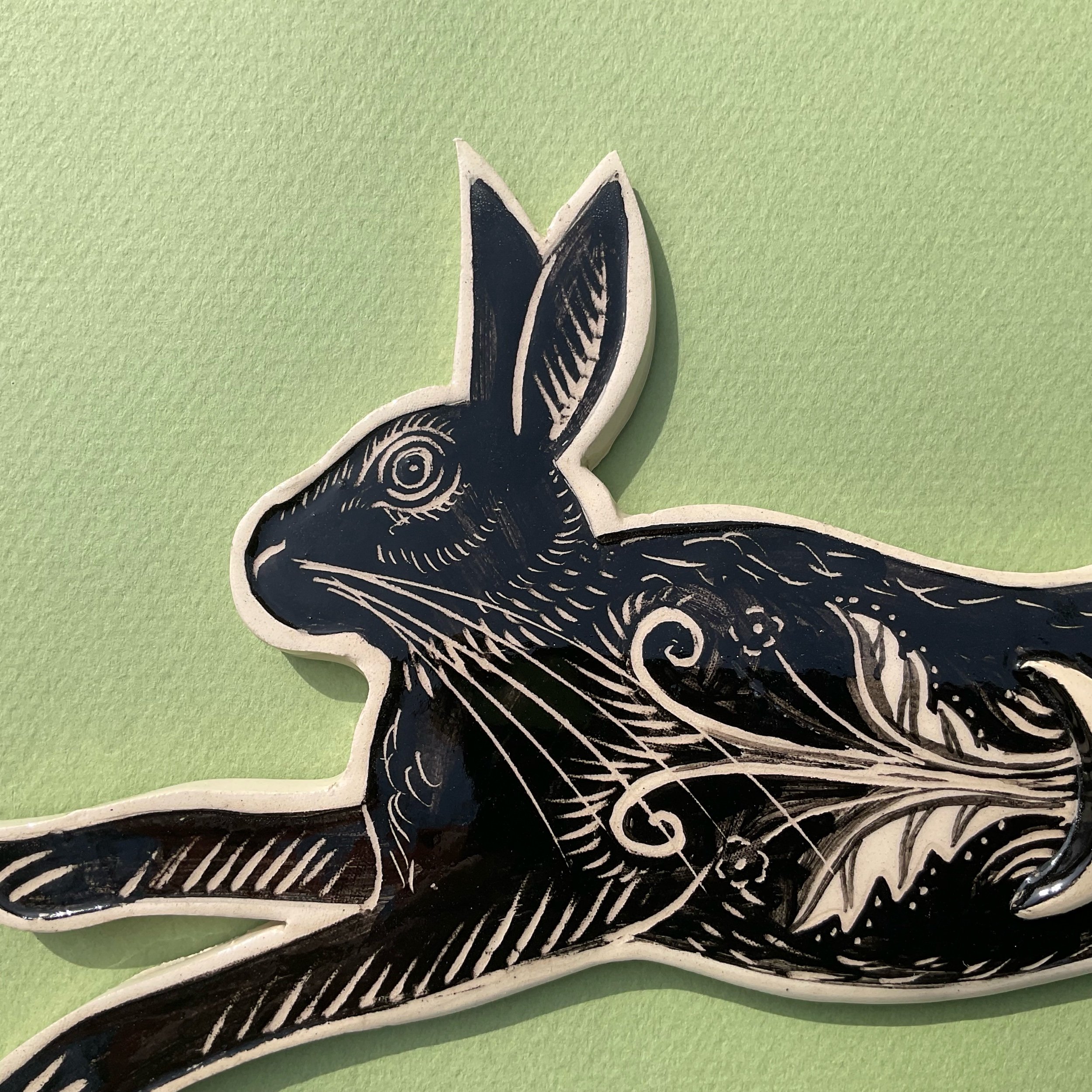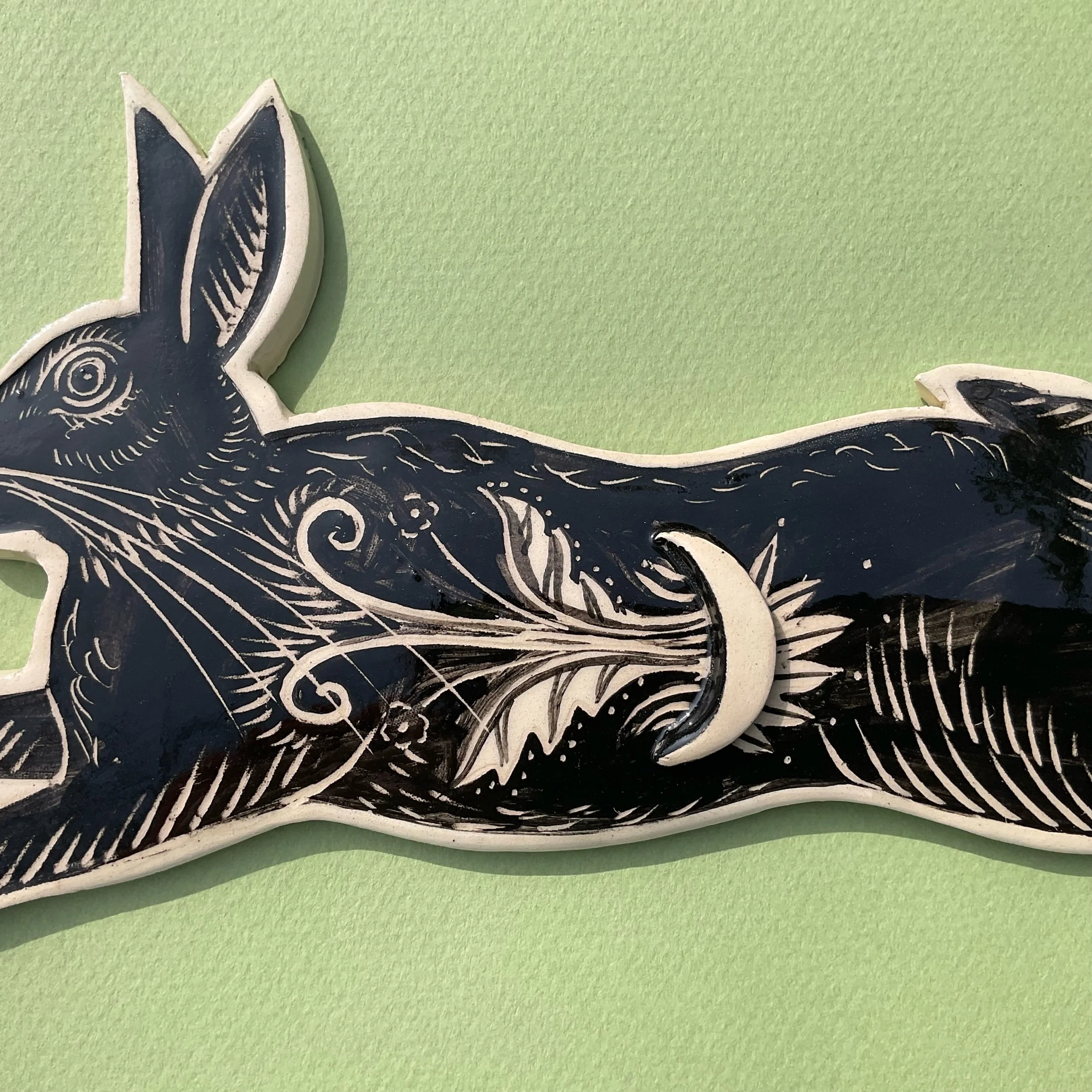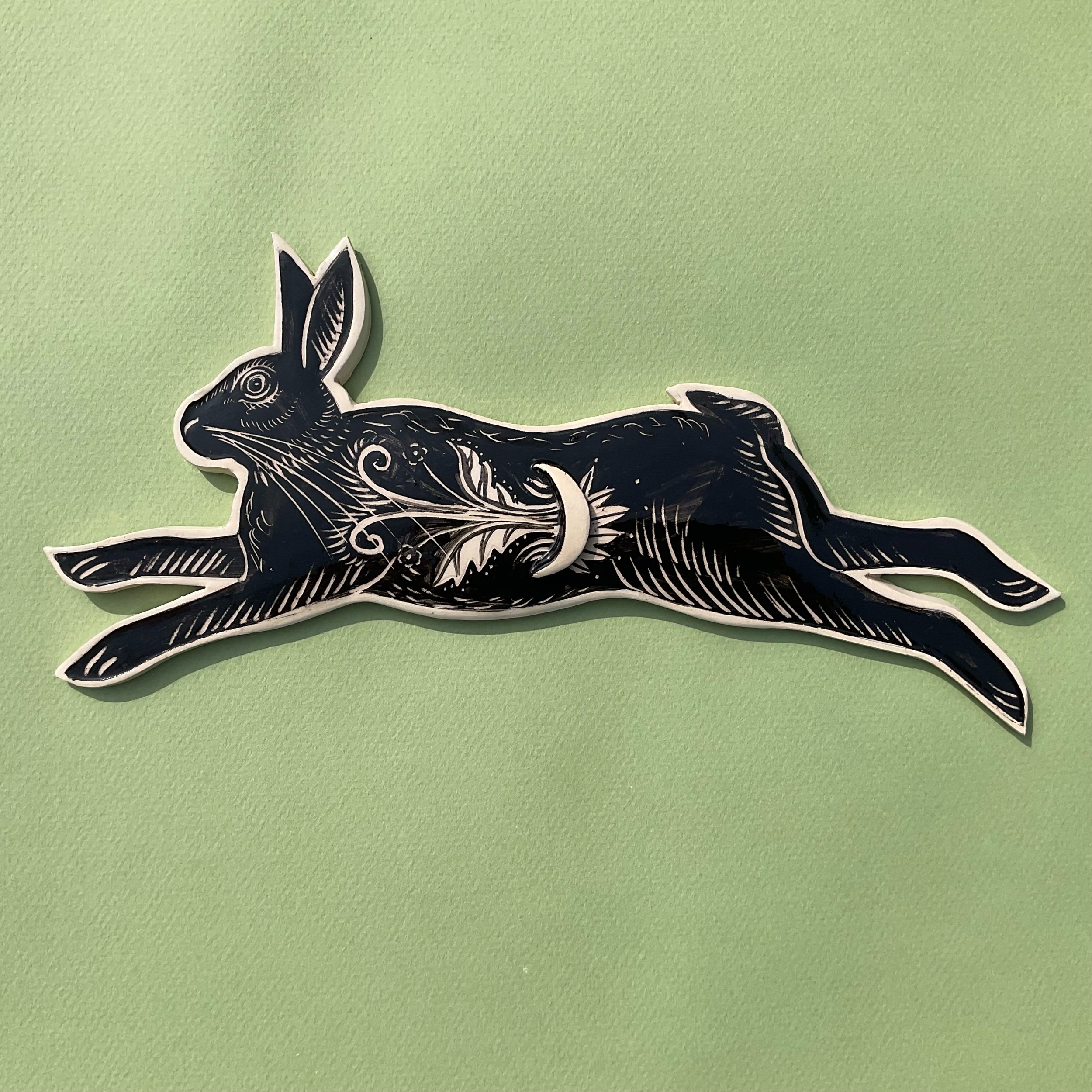 This wall hung spirit hare has been handmade in white earthenware and decorated with black slip which is then scratched back into using sgraffito tools to create a fine design similar to the look of lino prints or wood cuts.