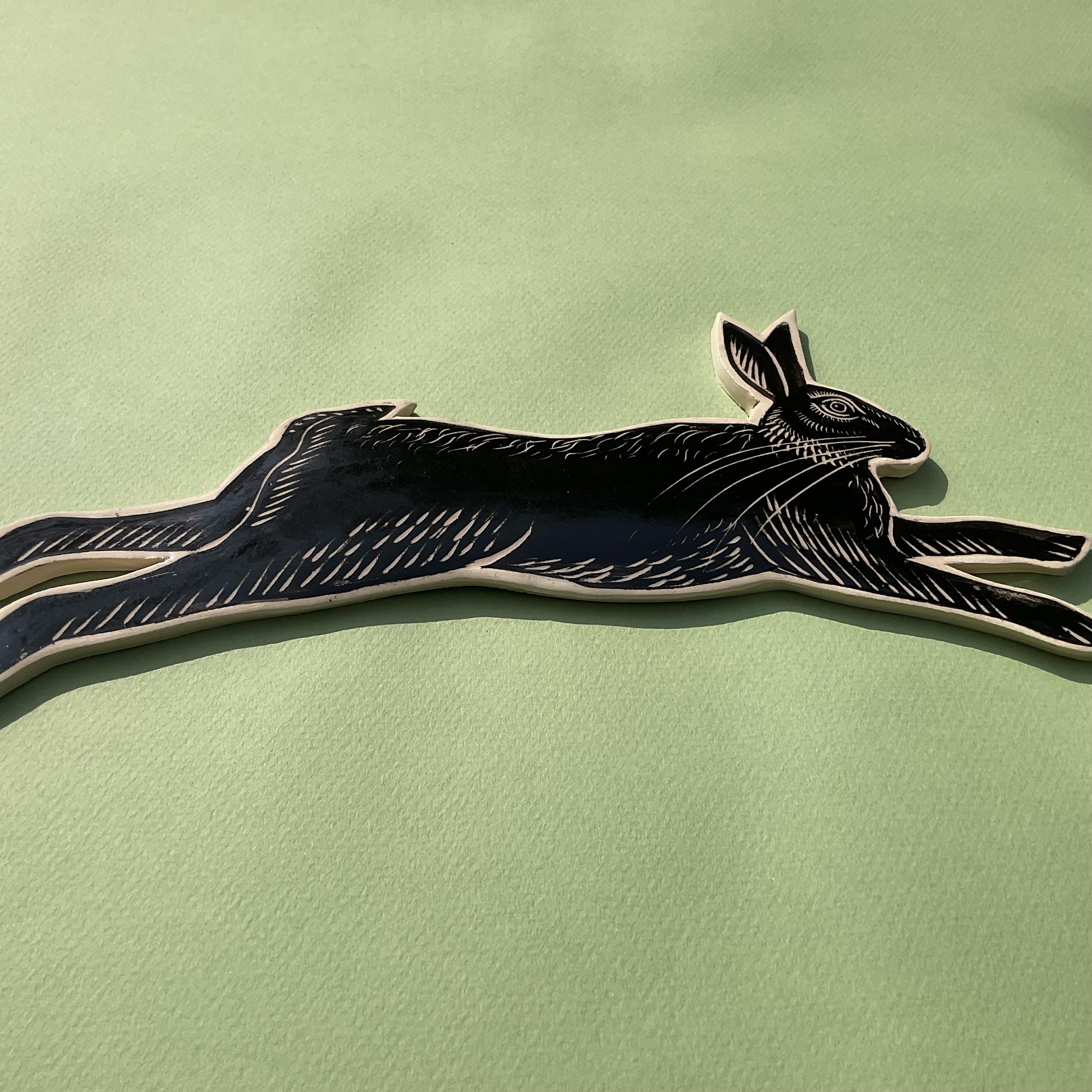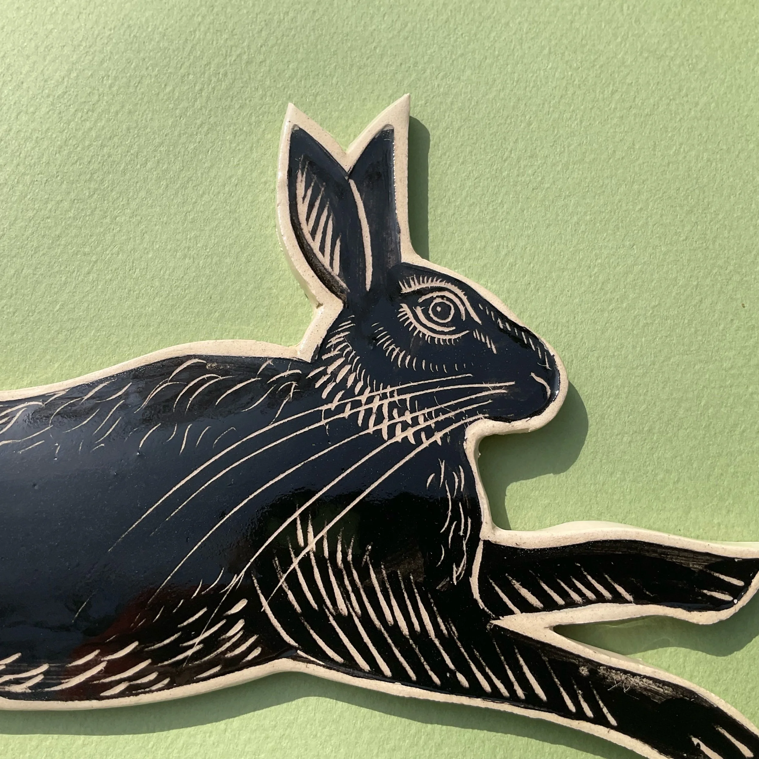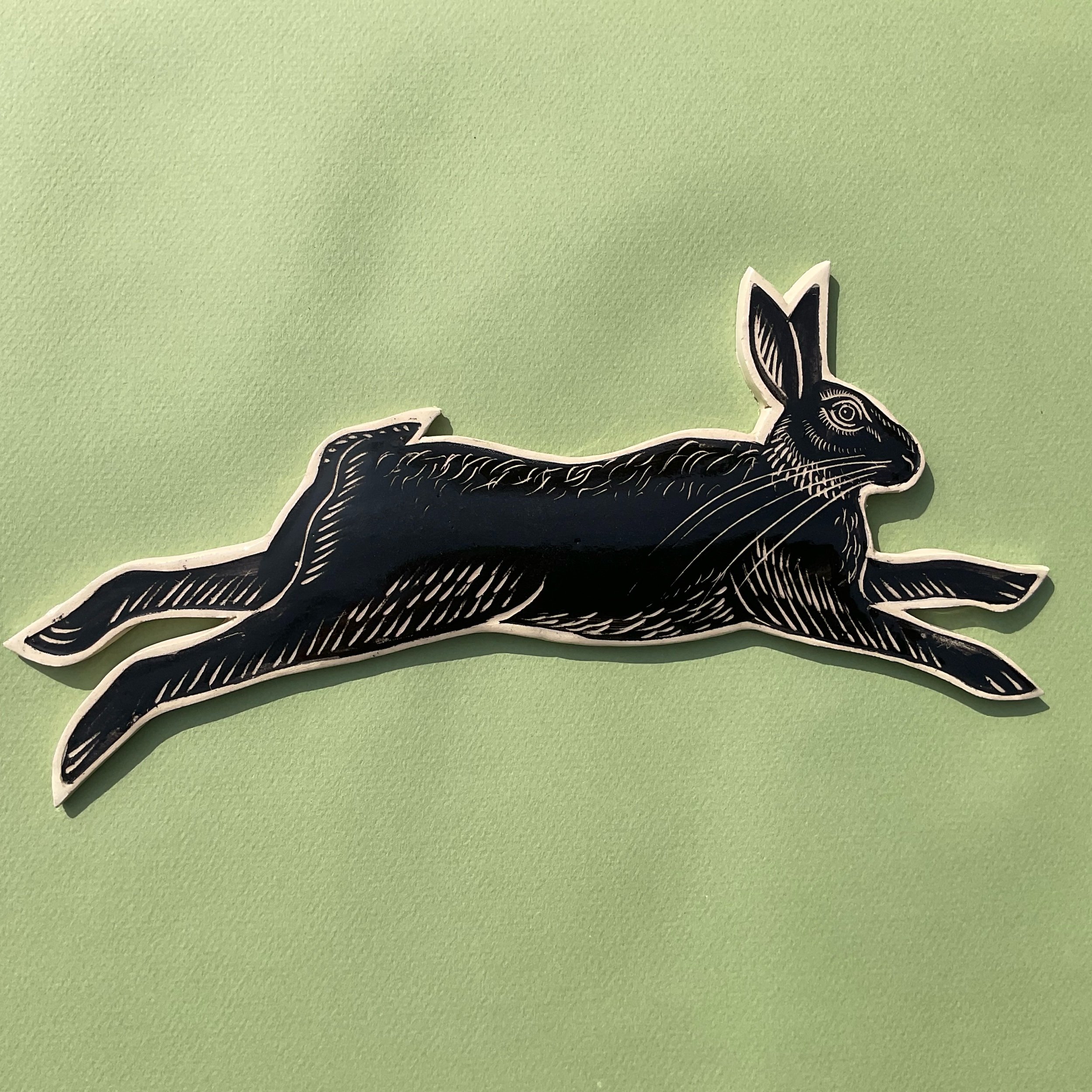 This wall hung spirit hare has been handmade in white earthenware and decorated with black slip which is then scratched back into using sgraffito tools to create a fine design similar to the look of lino prints or wood cuts.