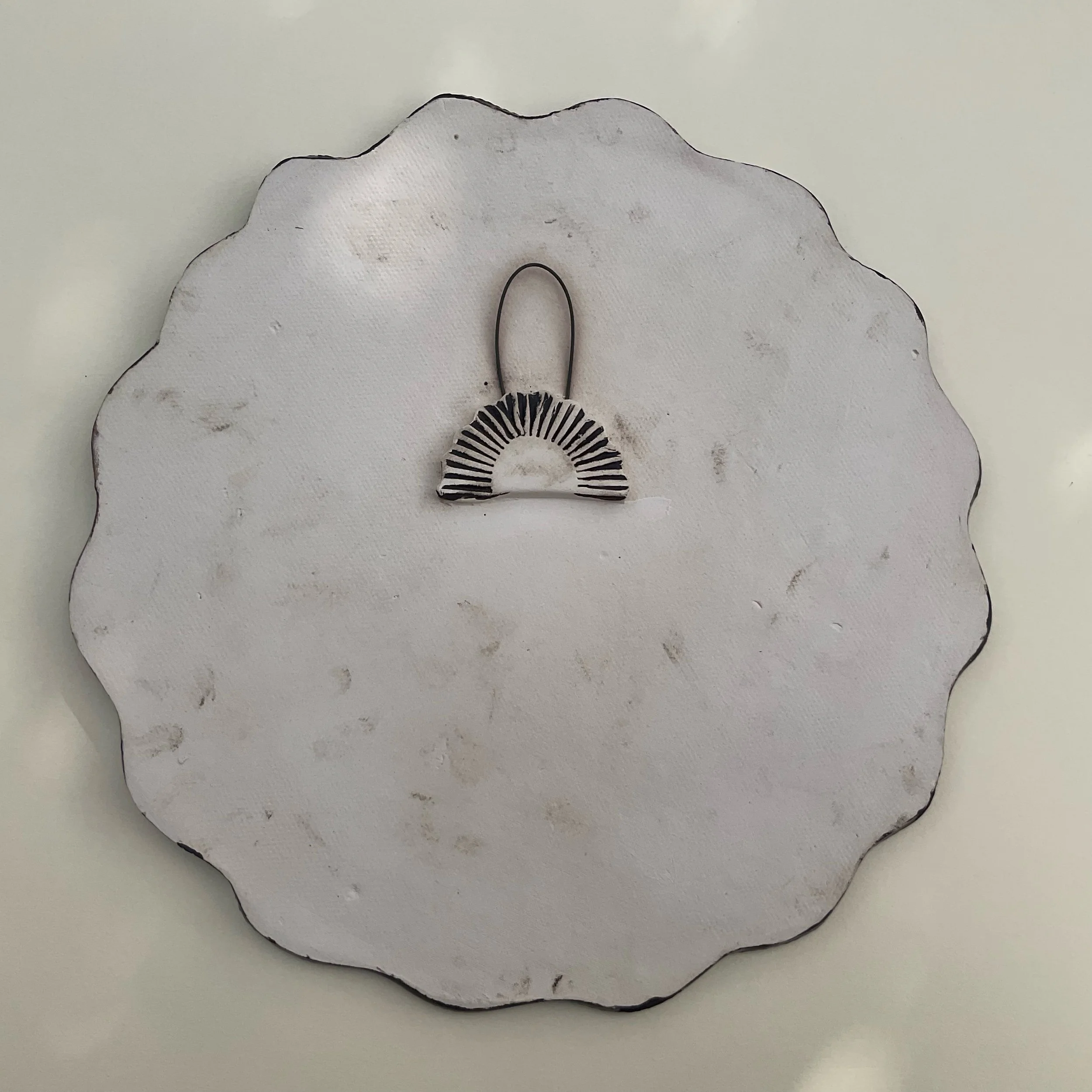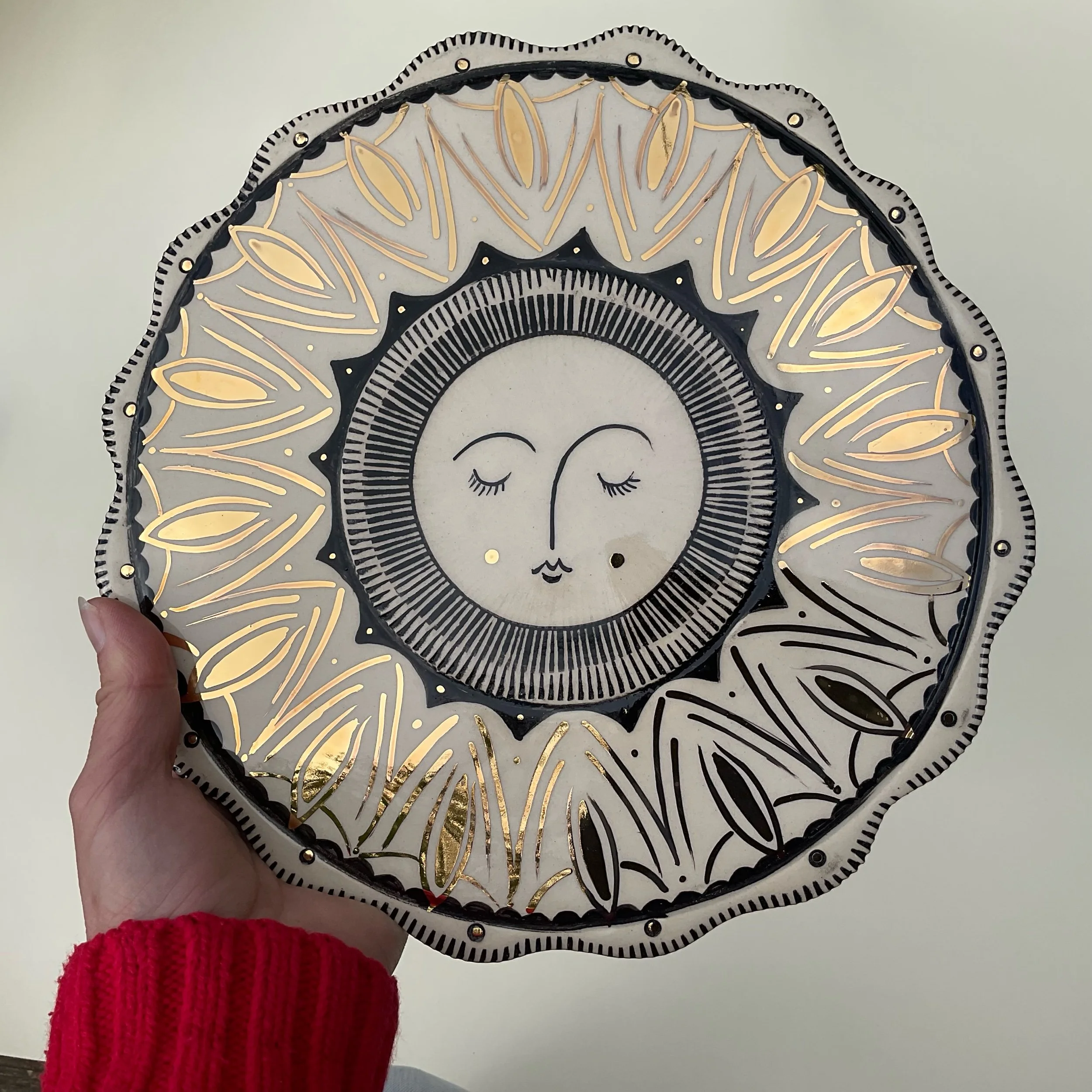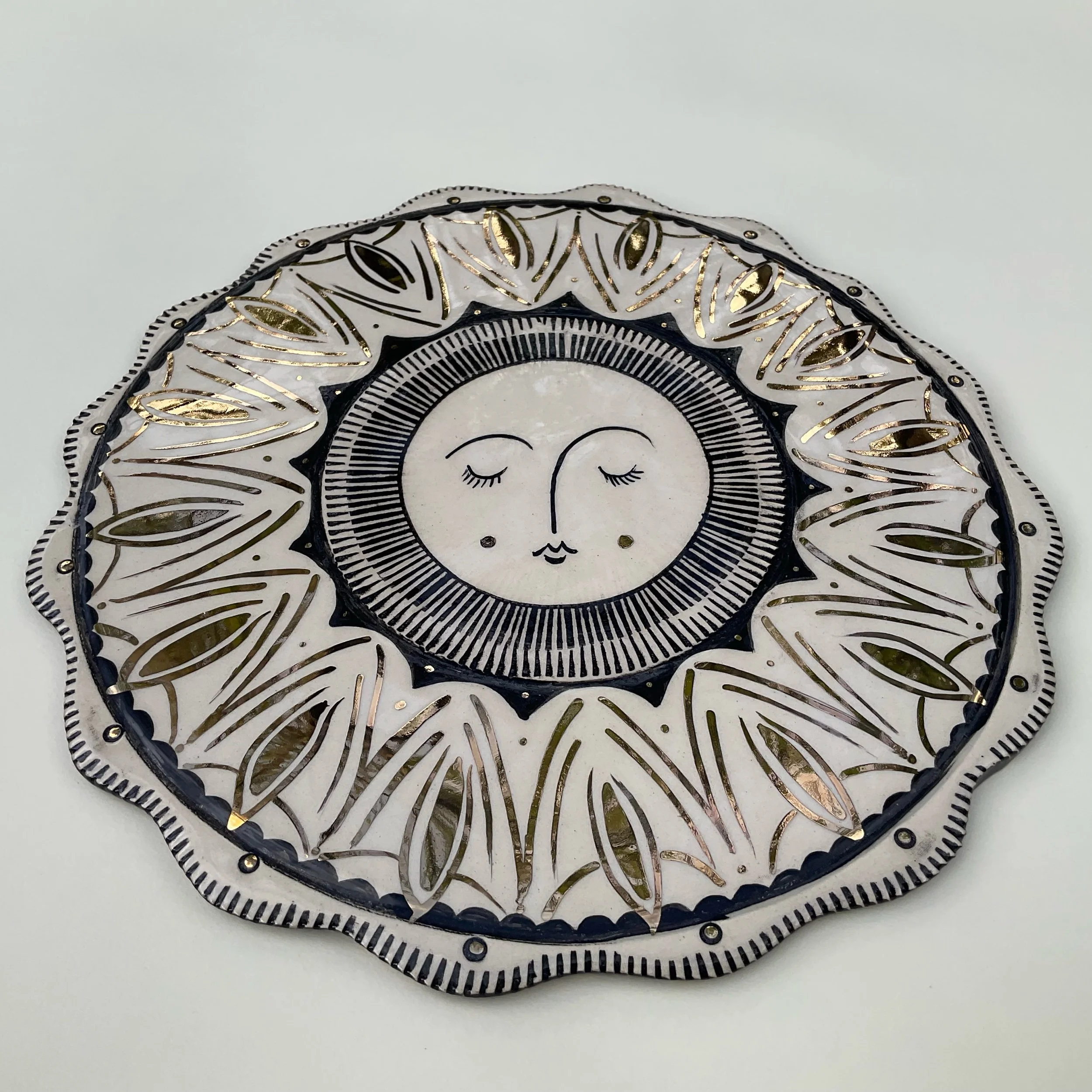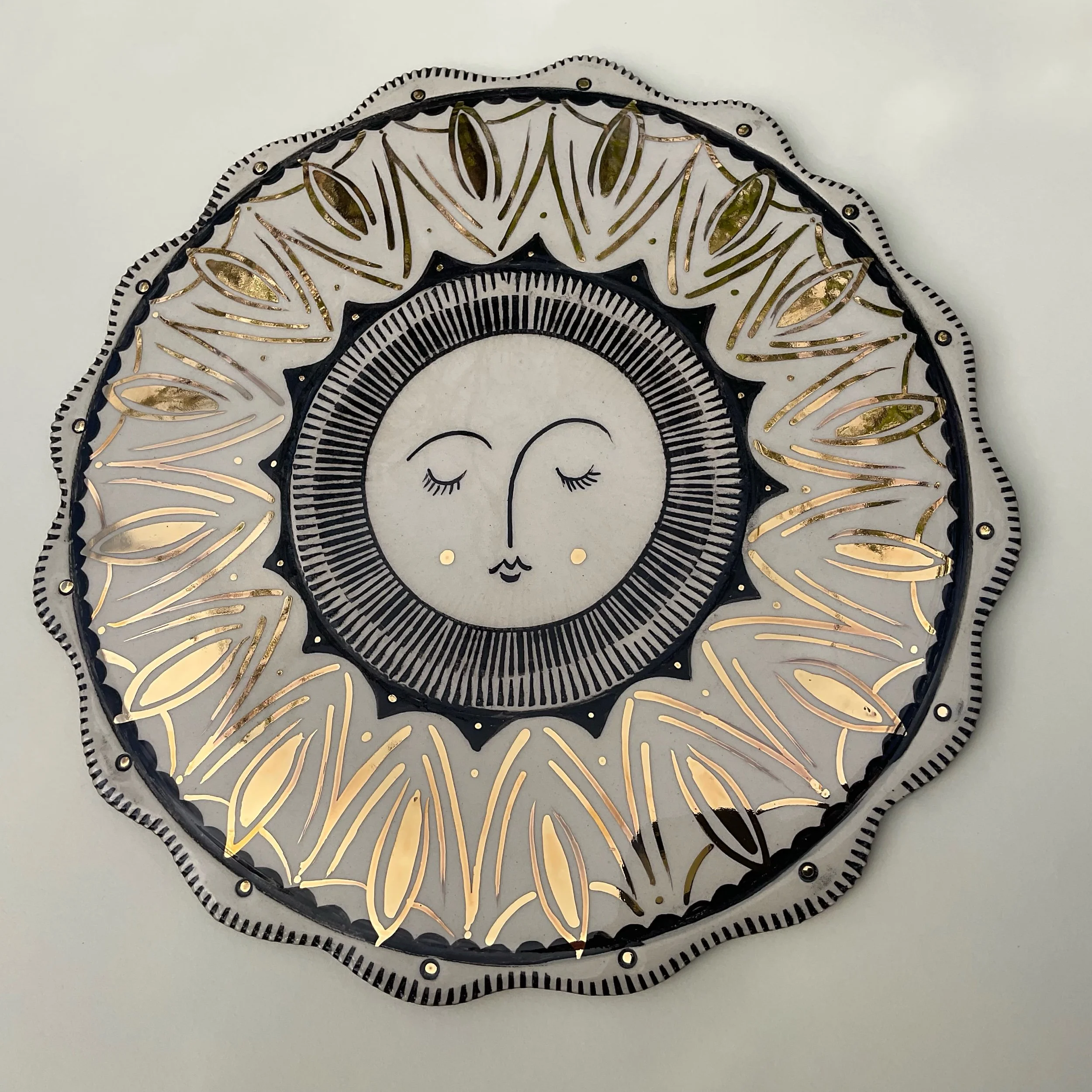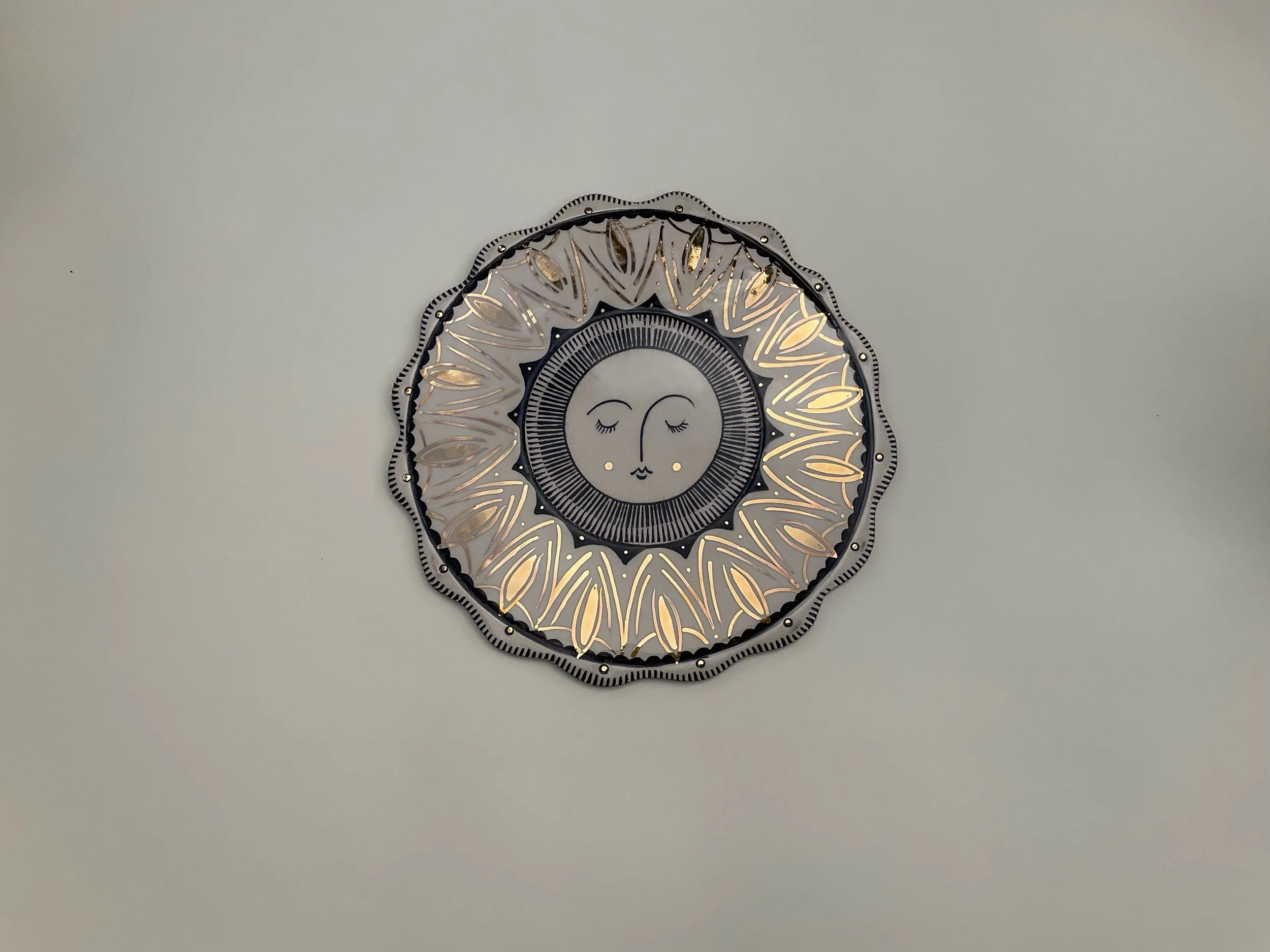 Beautiful large Sun Talisman handmade in earthenware with black slip and gold lustre detail. This wall hung piece can be placed inside or outside during the warmer months. It measures 24 cm in diameter and would make a lovely feature in your home.