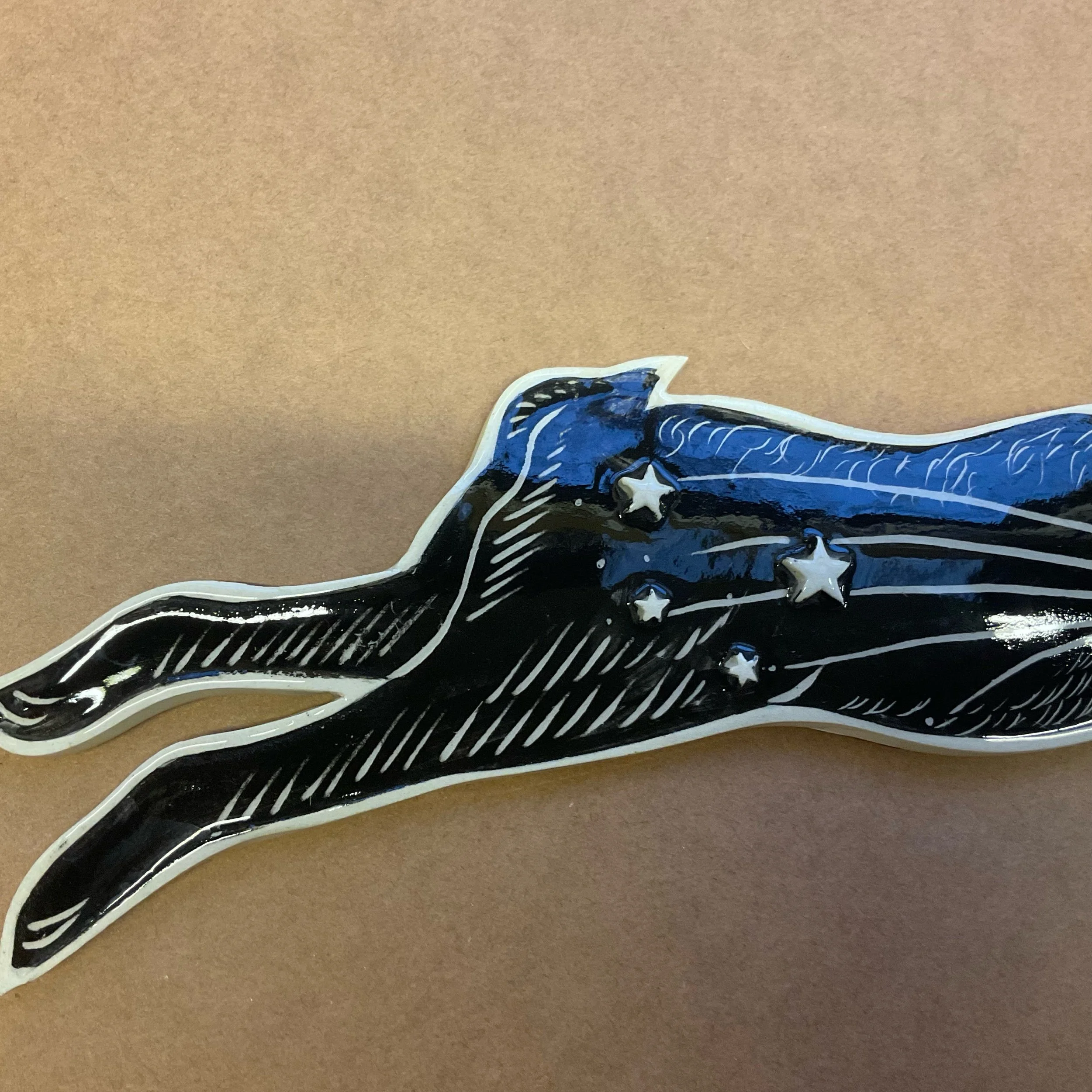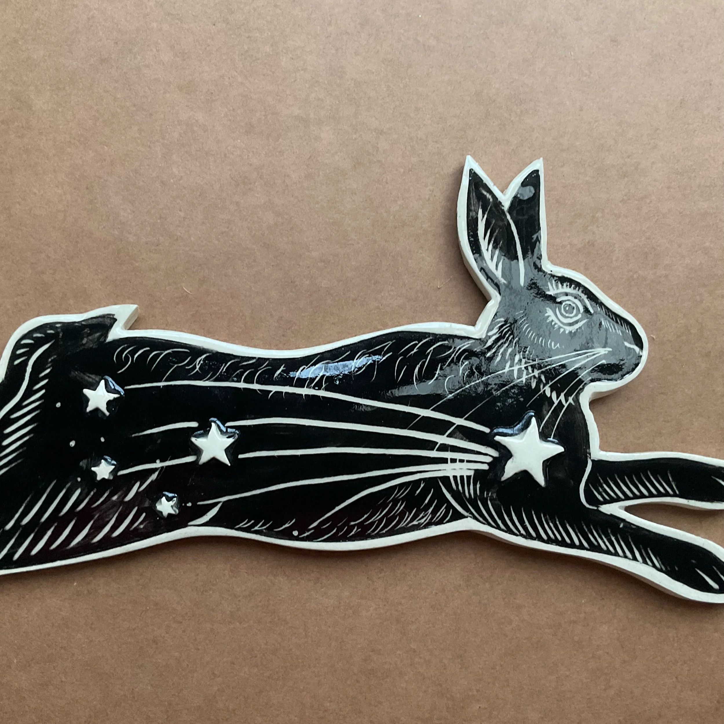 Beautiful Shooting Star Spirit Hare handmade in earthenware with black slip and sgraffito detailing.