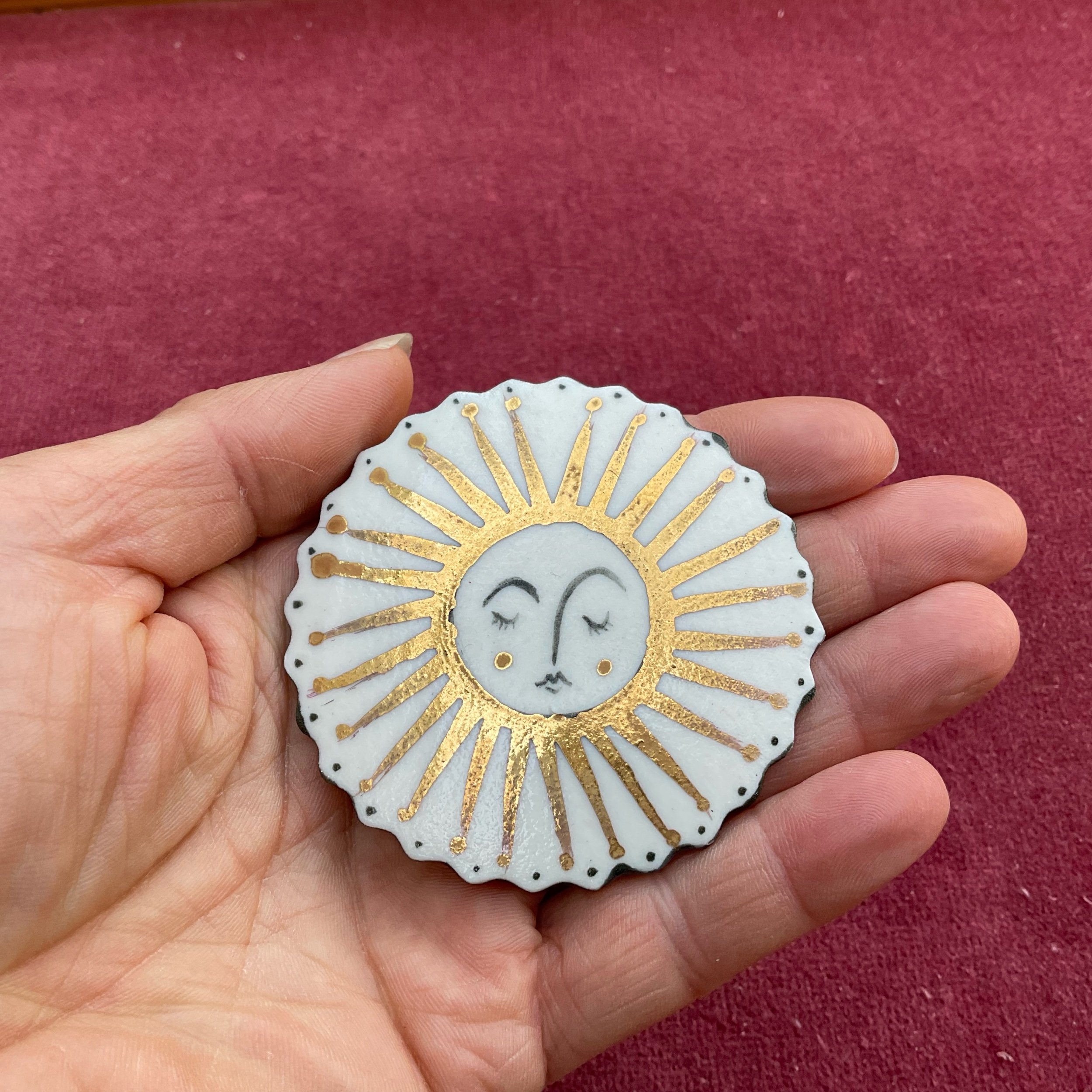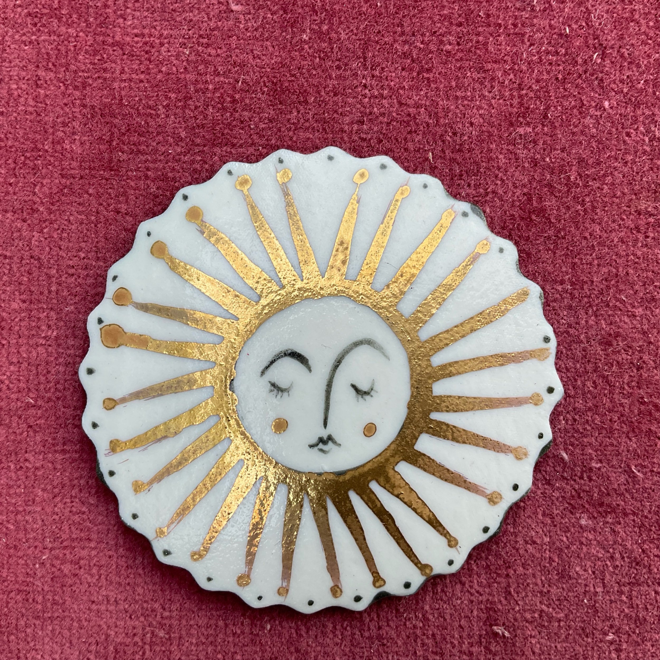 Lovely sun brooch handmade in porcelain with slip and gold lustre decoration. This piece comes gift boxed.