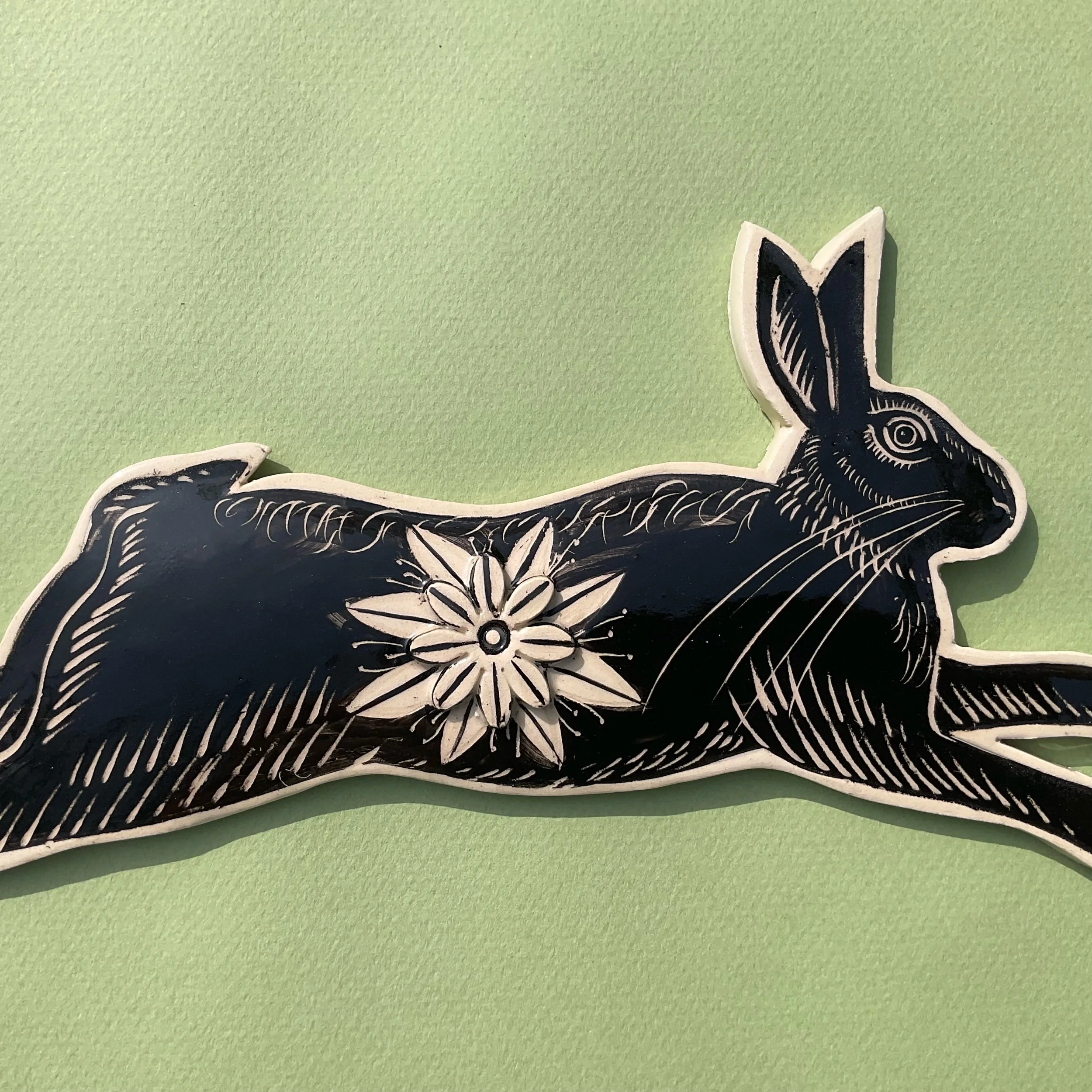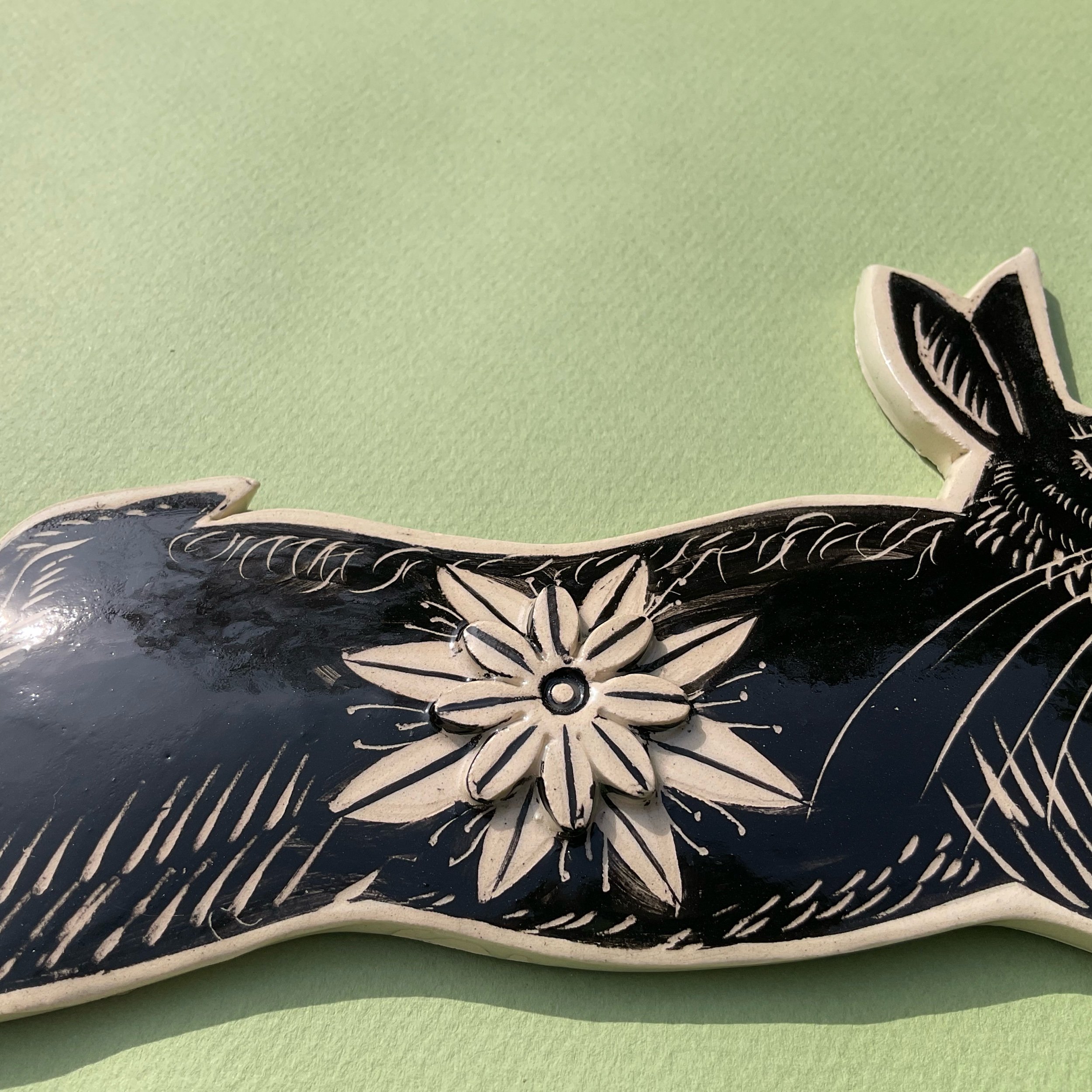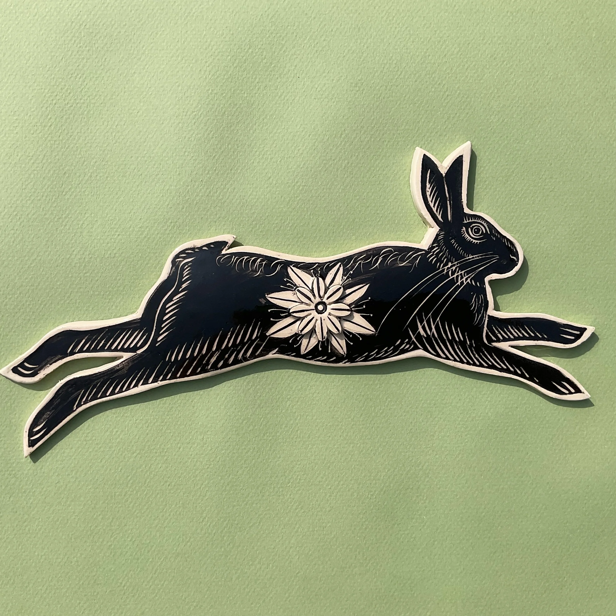 This wall hung spirit hare has been handmade in white earthenware and decorated with black slip which is then scratched back into using sgraffito tools to create a fine design similar to the look of lino prints or wood cuts.