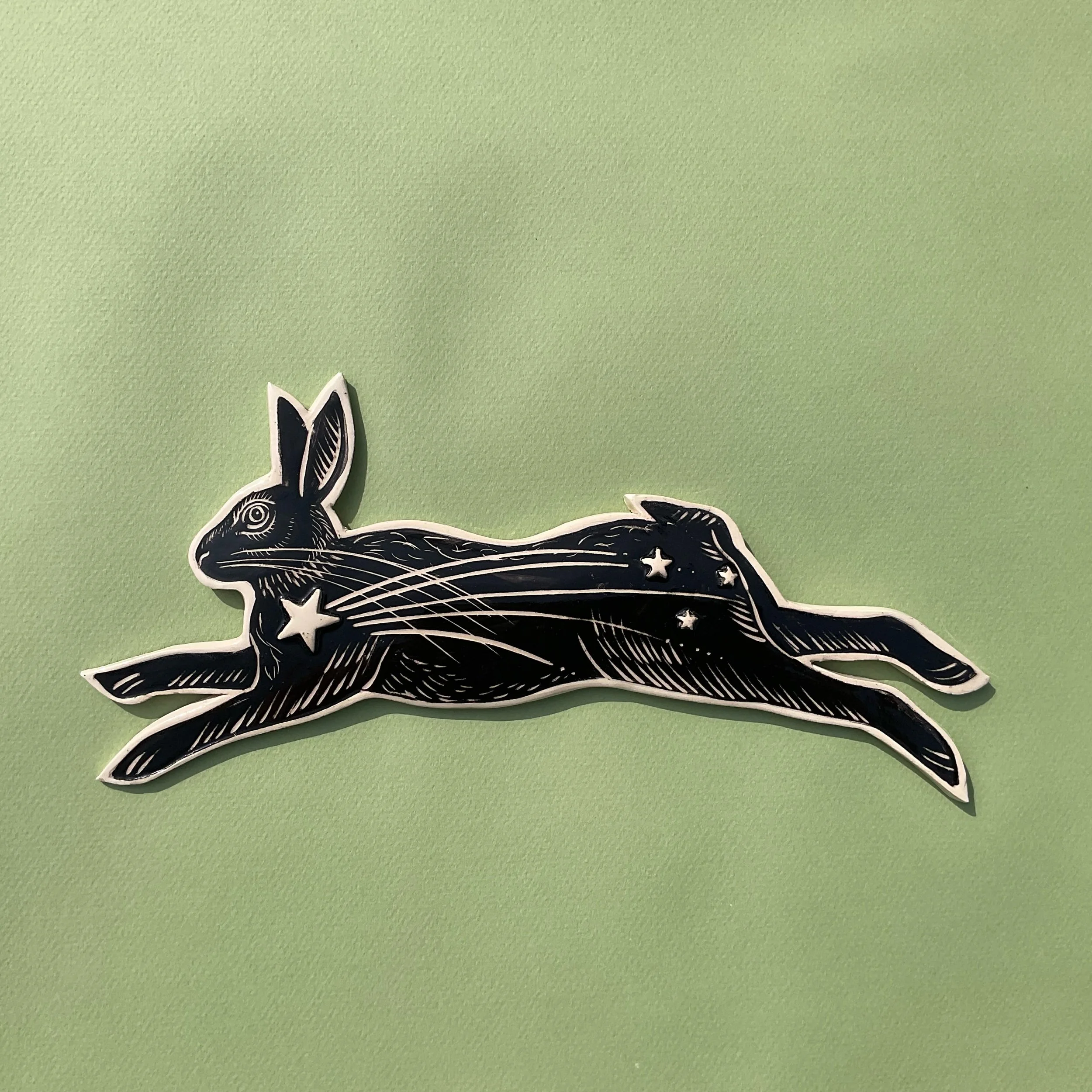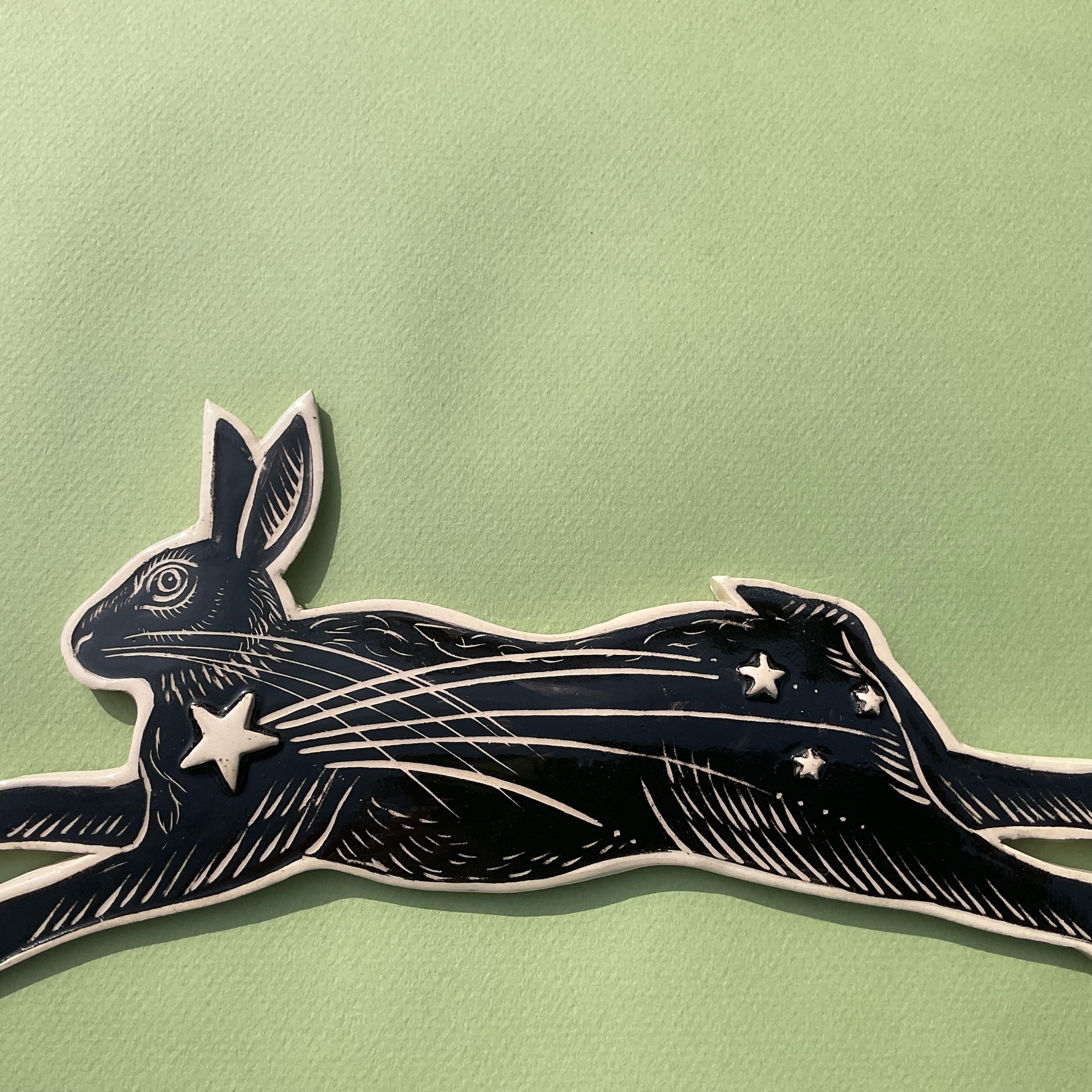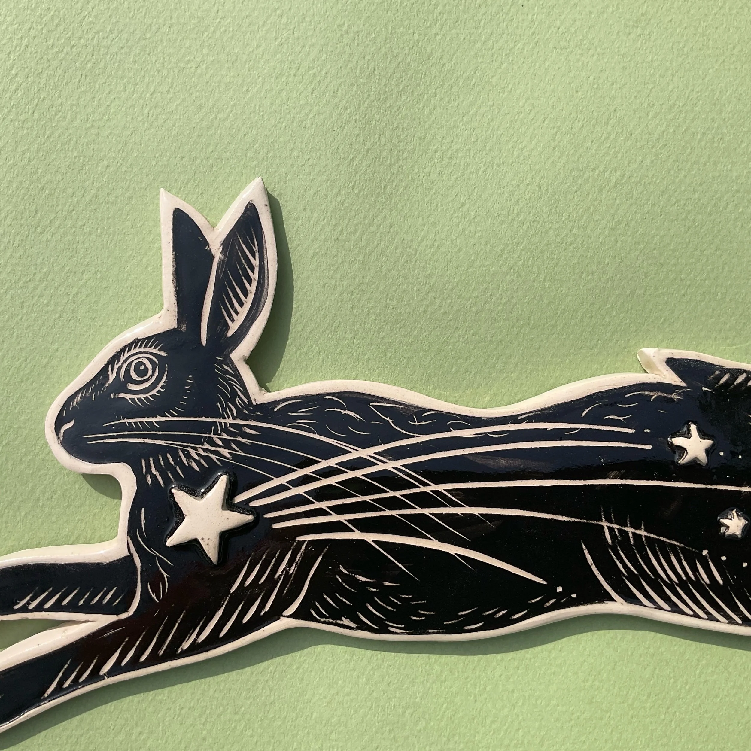 This wall hung spirit hare has been handmade in white earthenware and decorated with black slip which is then scratched back into using sgraffito tools to create a fine design similar to the look of lino prints or wood cuts.