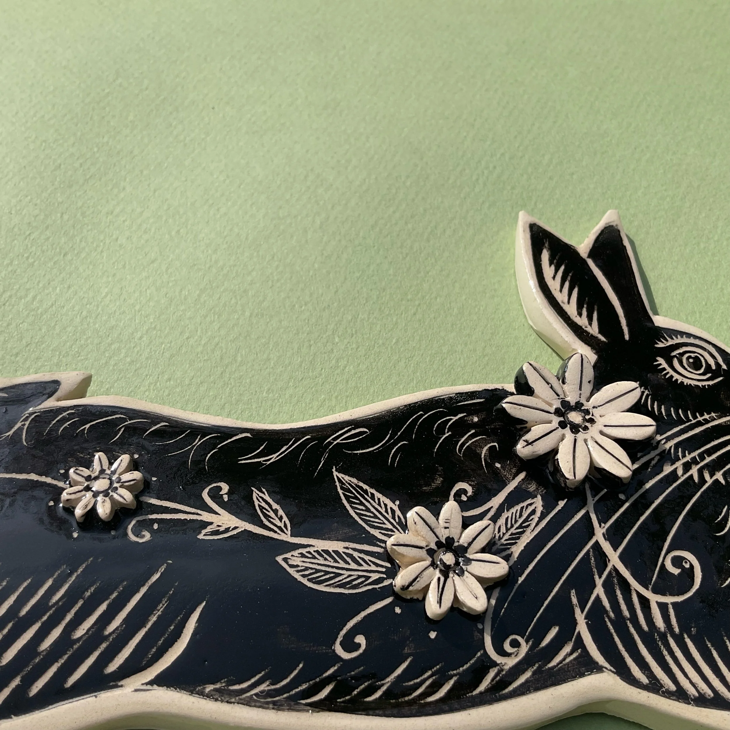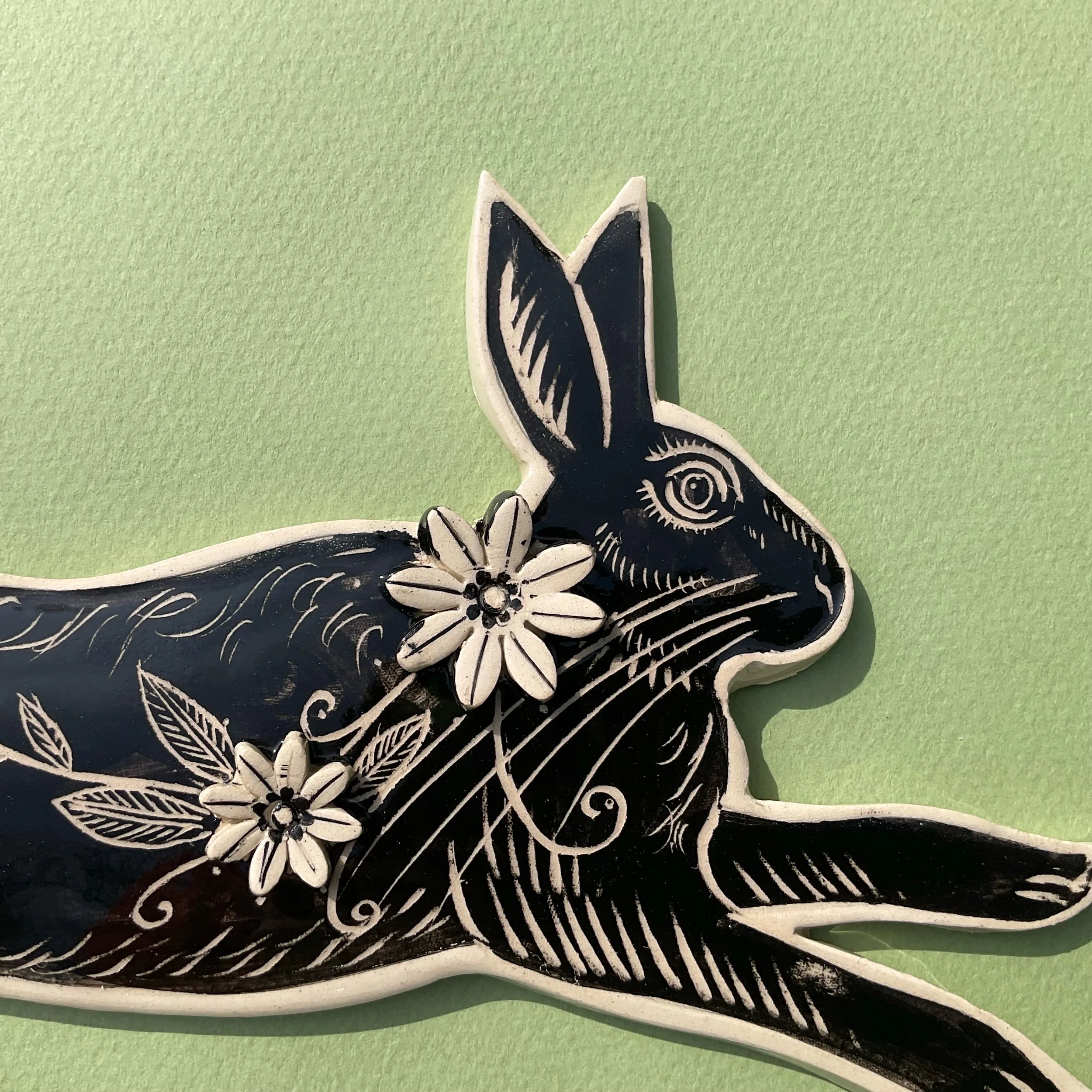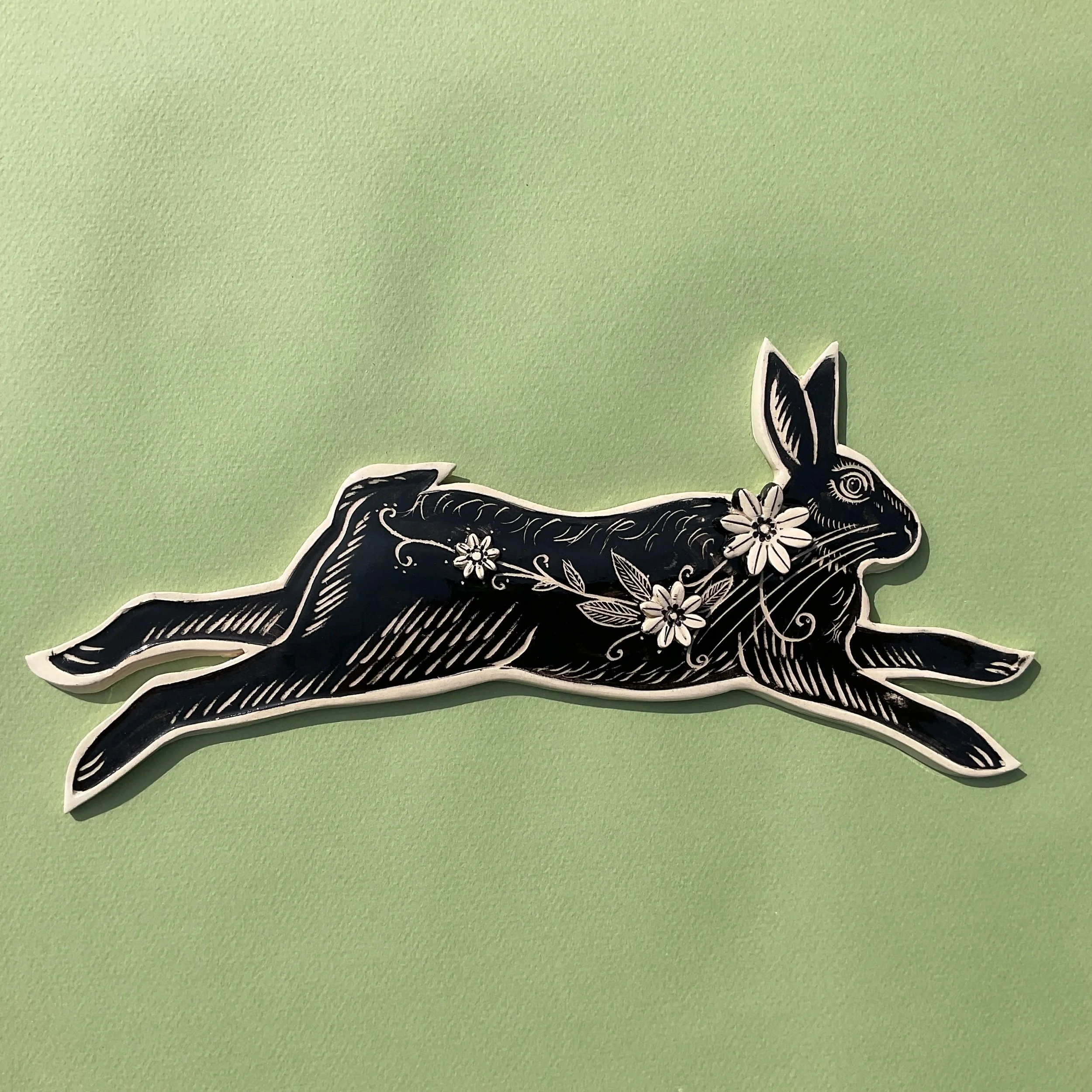 This wall hung spirit hare has been handmade in white earthenware and decorated with black slip which is then scratched back into using sgraffito tools to create a fine design similar to the look of lino prints or wood cuts.